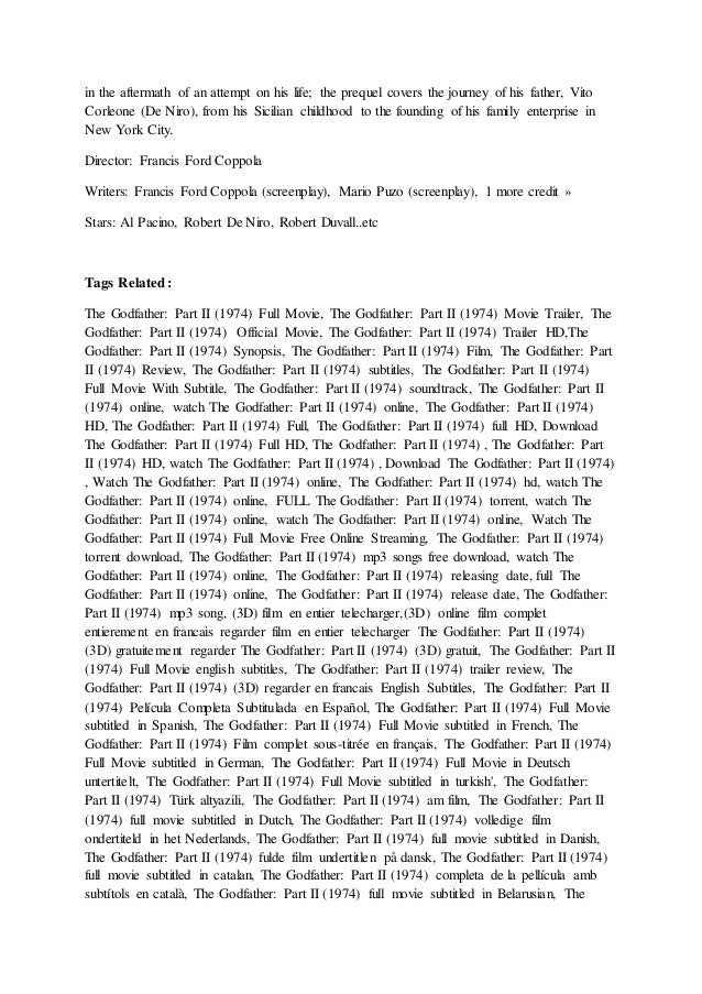 This story was written by kathleen carroll. I don't feel i have to wipe everybody out, tom. Part ii 1974 hd trailer. The godfather, part ii (1974) of the godfather trilogy continues the saga of the corleone family, serving as both a prologue and a sequel, extending over a period of 60 years and three generations.